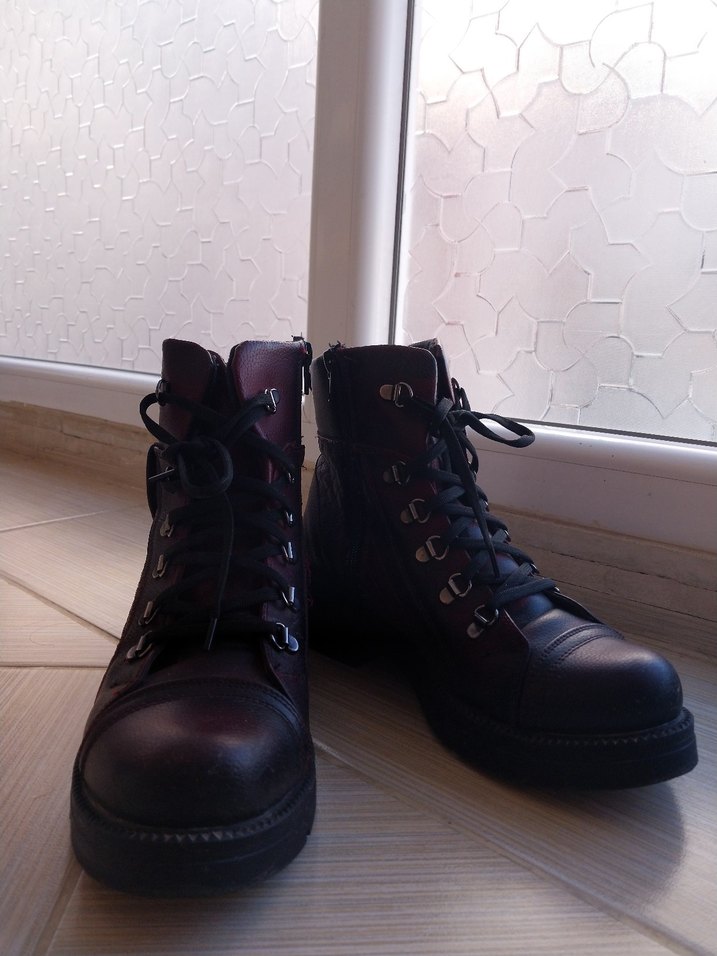 Bordo deri, tokalı ve yüksek topuklu bu botlar gotik tarzı ve rock punk havasını yansıtıyor. Günlük kullanıma uygundur.