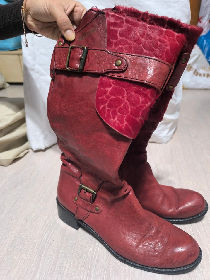 Bordo deri, diz boyu, yüksek topuklu tokalı kadın çizme, yumuşak dokulu iç astarla.