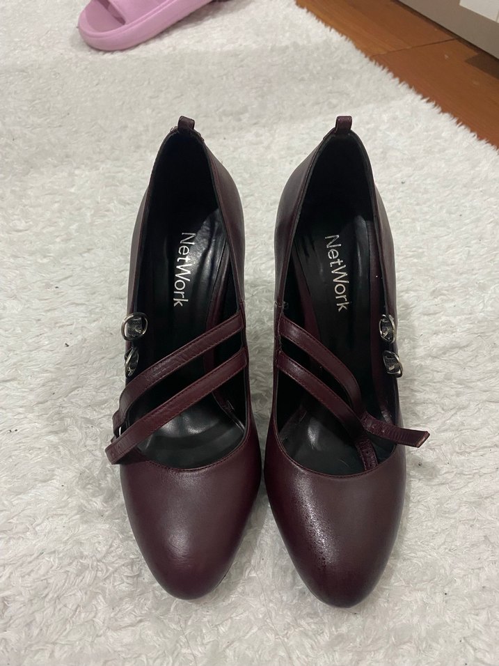 Bordo deri yüksek topuklu stilettolar, tokalı bantlarıyla klasik ve zarif gotik tarzı yansıtır. Ofis kullanımı için uygundur. Marka: NetWork.