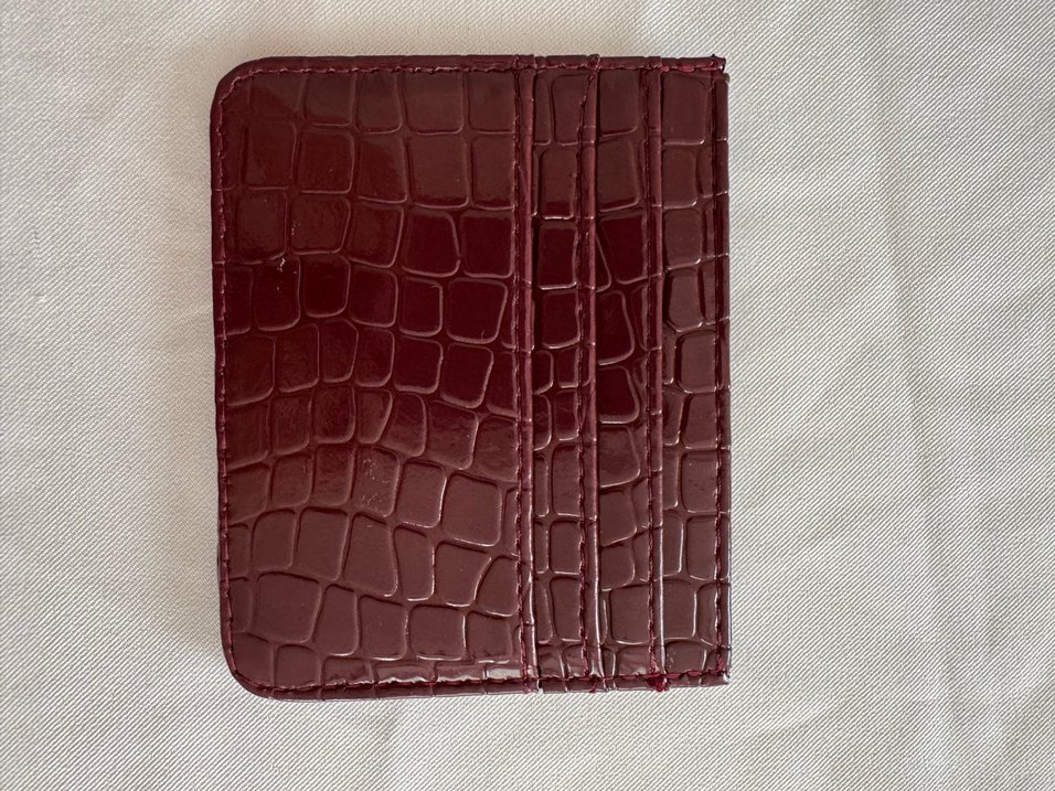 Bordo yılan desenli deri cüzdan, fermuarlı kapanış ve çağdaş tasarım sunar, günlük kullanıma uygundur.