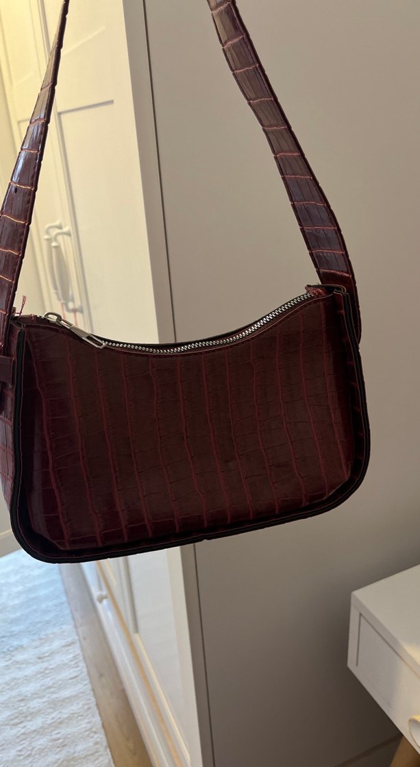 1 kez kullandim Bordo deri, koyu yılan desenli ve tokalı askıya sahip cesur sokak modası çantası.
