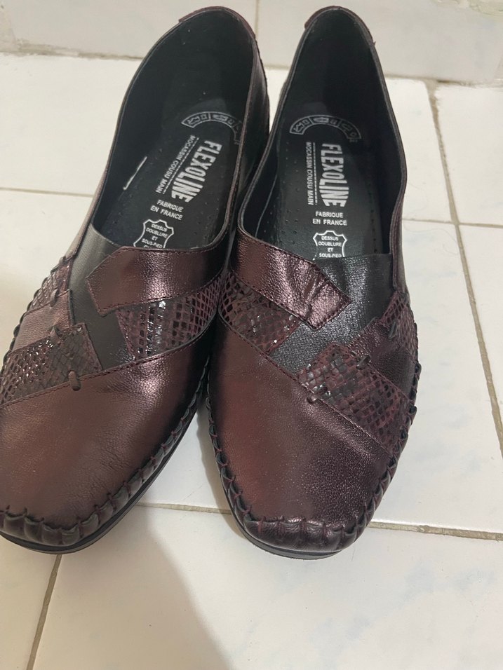 Bordo deri, yılan desenli desen ve tokalı detaylı, dolgu topuklu kadın ayakkabısı, günlük kullanıma uygundur.
