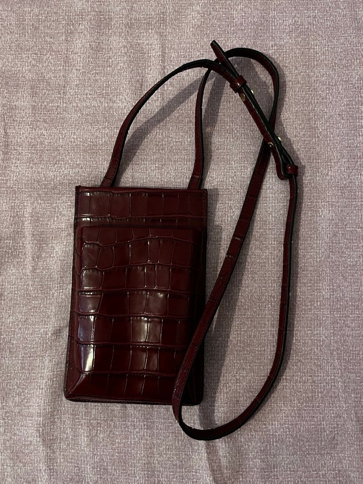 Bordo deri yılan deseni ve tokalı detaylı, uzun ayarlanabilir askılı kadın çanta, sokak modasına uygun.