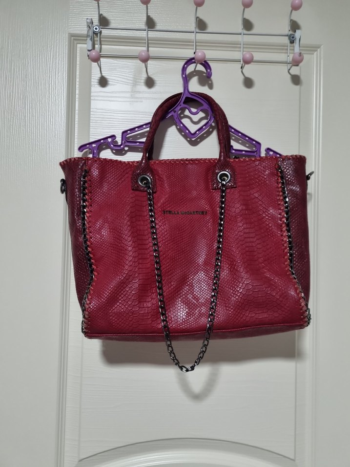 Bordo deri yılan desenli çanta, zincir detaylarıyla günlük kullanıma uygun, sade ve şık bir görünüme sahiptir.