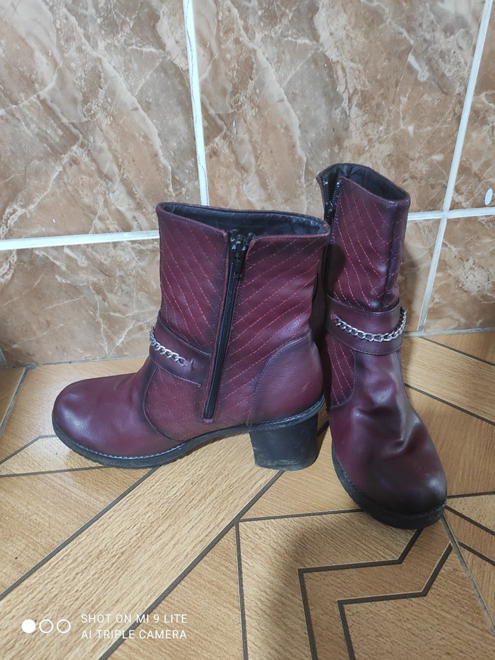 Bordo deri biker botlar, kalın topuk ve zincir detayına sahip, parlak görünümlü günlük kullanıma uygun.