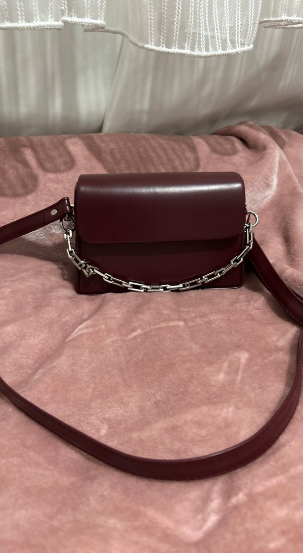 Bordo deri, zincir detaylı, desen içermeyen kadın çantası. Günlük kullanım ve sokak modasına uygun şık tasarım.