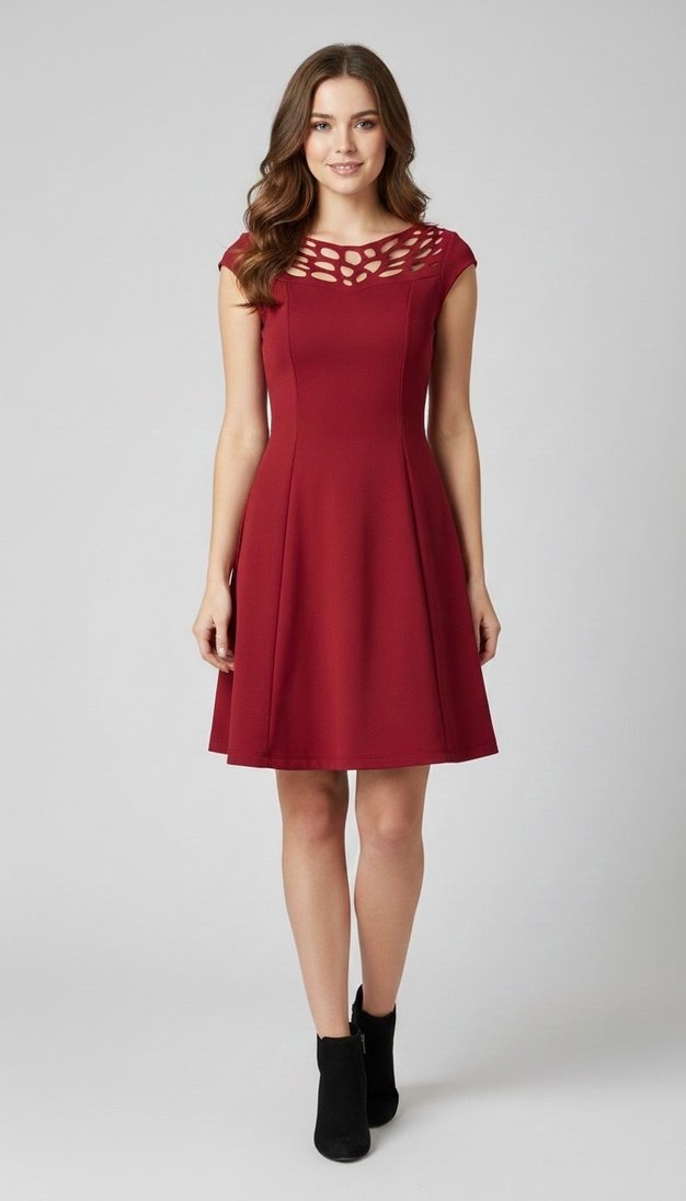 Bordo renkli, Desen detaylı hafif V yakalı, beli oturan ve etek kısmı genişleyen midi elbisedir. Pürüzsüz sentetik kumaştan yapılmıştır. !!!! 1 kere kınada giyildi defosu yok sıfır ayarında yeni elbise !!!!