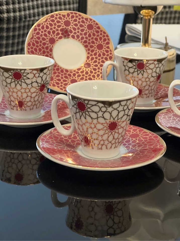 Altın detaylı bordo geometrik desenli, 6'lı fincan ve 4 tabak. Sofistike bir görünüm.