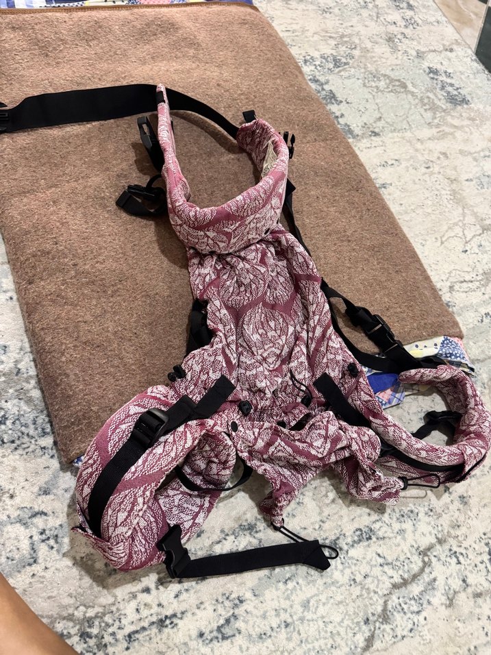Ayarlanabilir bantlı, yumuşak kumaşlı bordo desenli bebek taşıyıcı.
