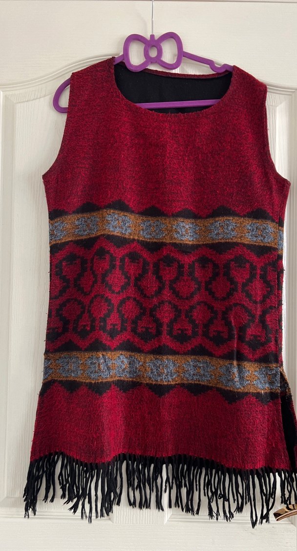 Bordo renkte, yuvarlak yakalı, uzun ve bol kesim örgü desenli bohem stil kadın yelek. terziye şaldan diktirmiştim