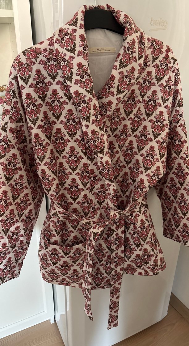 Bordo renkli, uzun kollu, midi boy ve bol kesim mont kimono tarzı . Bohem desenli ve belden kuşaklı rahat bir tasarıma sahiptir.