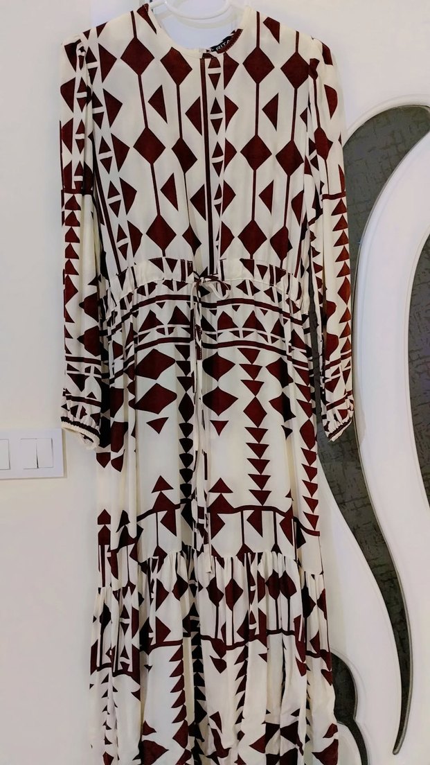 Bordo renkli geometrik desenli, uzun kollu, v yaka bohem tarzda uzun elbise. Belde kuşaklı, bol kesim ve yumuşak dokulu kumaştan yapılmıştır.