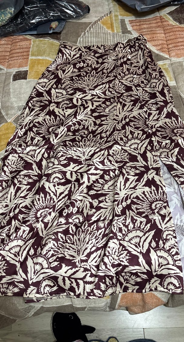 Bordo renkli, desenli tekstil kumaştan, bol kesim ve drapeli uzun bohem etek.