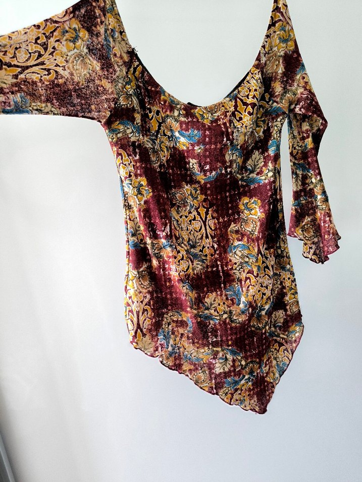 Bordo tonlarında, desenli tekstil kumaştan yapılmış, bohem tarzda, drapeli, uzun kollu, salaş ve uzun kesim bluz.