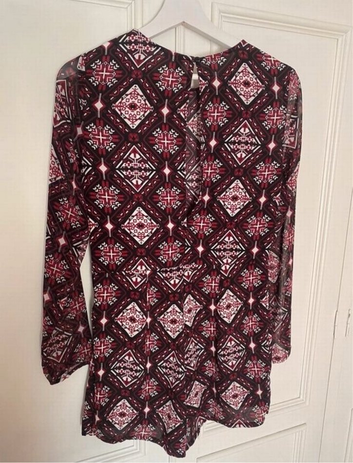 Bordo renkli bohem esintili, desenli, uzun kollu ve yuvarlak yakalı tulum. Rahat kesimli, düğmeli detaylı, mini boy, yumuşak sentetik kumaştan. Transparan