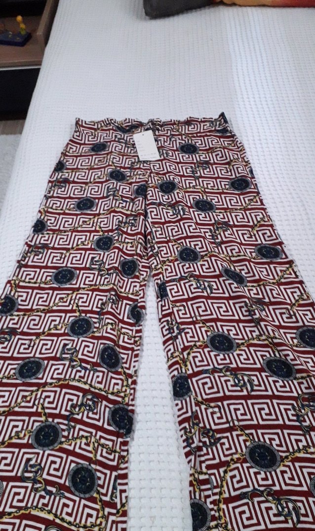 Bordo renkli, desenli sentetik kumaştan yapılmış, bol kesim ve uzun boylu, kemerli kadın pantolonudur. Rahat bohem tarzı için uygundur. tiril kumas harika
