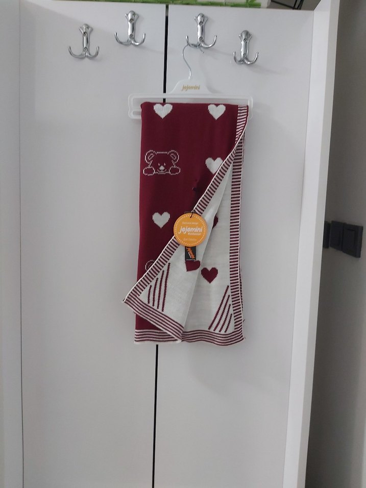 Yumuşak ve sıcak kumaştan, bordo renkli, kalp ve ayı desenli çocuk battaniyesi.