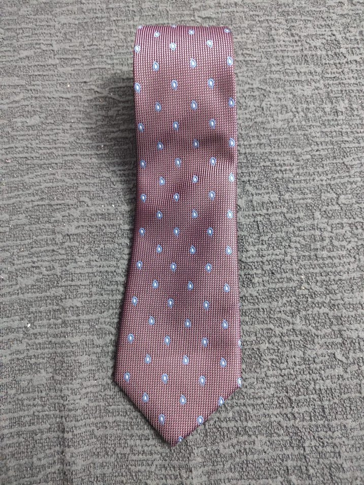 Bu erkek kravatı, küçük mavi noktalarla bordo renkte olup, iş ortamına uygun çağdaş bir görünüm sunar. Gri tonlarla uyum sağlar.