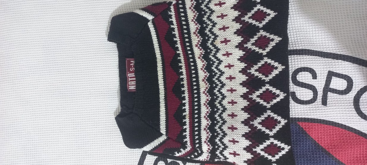 Bordo, siyah ve beyaz desenli, uzun kollu ve yuvarlak yakalı, bohem tarzda, fitted kesim erkek örgü kazak. Rahat ve günlük kullanım için uygundur.