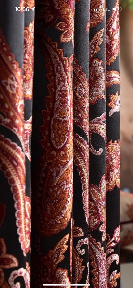 Bordo renkli, geleneksel desenlere sahip perde, sıcak ve şık bir ortam yaratır. Kumaşı zengin ve klasik bir görünüm sunar.
