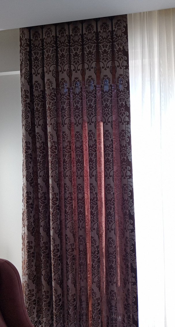 Bordo renkli, koyu desenli ve geleneksel tarzda tasarlanmış perde, mekâna şıklık ve derinlik katar.