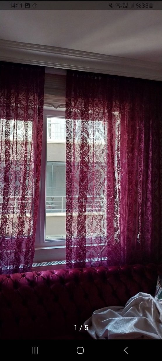Odaya zarafet ve mahremiyet katan koyu tonlarda bordo desenli geleneksel perdeler. rengi koyudur mor ve kenarda ipleri var çekerek gon yapılıyor çok az kullanıldı