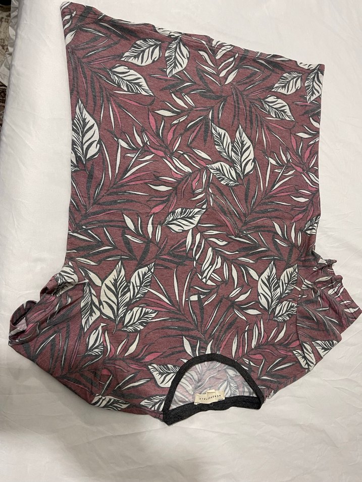 Bordo tonlarında, yaprak desenli, straplez kısa kollu, bol kesim ve drapeli uzun hamile bohem tunik. Günlük kullanıma uygundur.