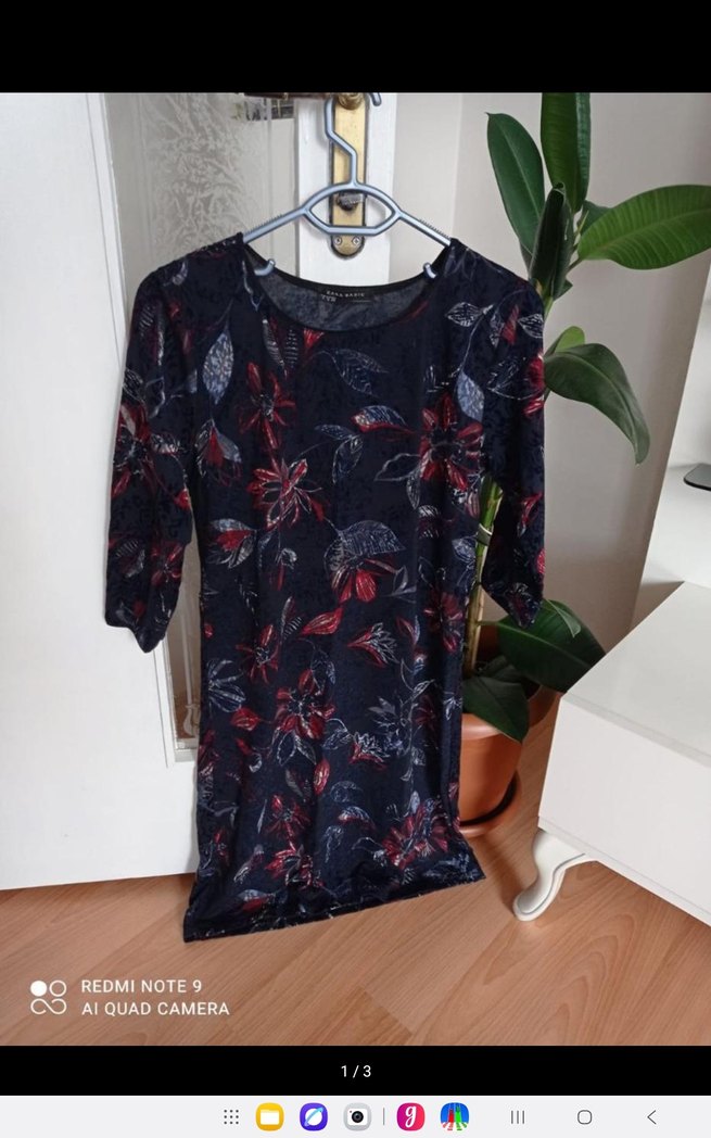 Bordo renkli, kısa kollu, yuvarlak yakalı, bol kesim ve drapeli hamile tunik. Koyu renkli, desenli kumaşıyla gündelik kullanıma uygundur.
