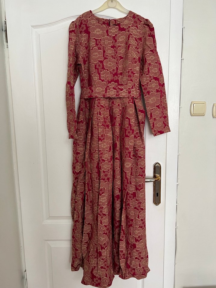Bordo desenli uzun kollu, yüksek yakalı, bol kesim ve drapeli kadın elbisesi. S-M beden uyumludur.