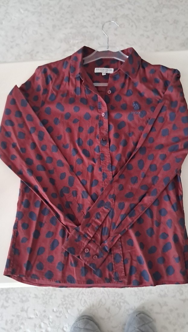 Bordo renkli, uzun kollu, düğmeli ve yakalı kadın gömleği. Rahat kesimli ve normal boyda, koyu desenli ve yumuşak sentetik kumaştan üretilmiştir.