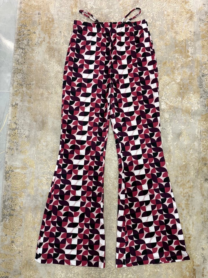 Bordo geometrik desenli, kürk detaylı kadın ispanyol paça pantolon. Yumuşak sentetik kumaştan, romantik gece için uygun.