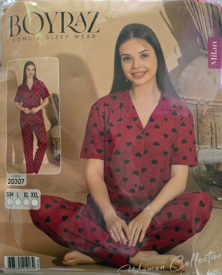 Bordo renkli, kısa kollu, bol kesim ve desenli pijama takımıdır. Midi boyda olup rahat ve çağdaş bir stil sunar. ️