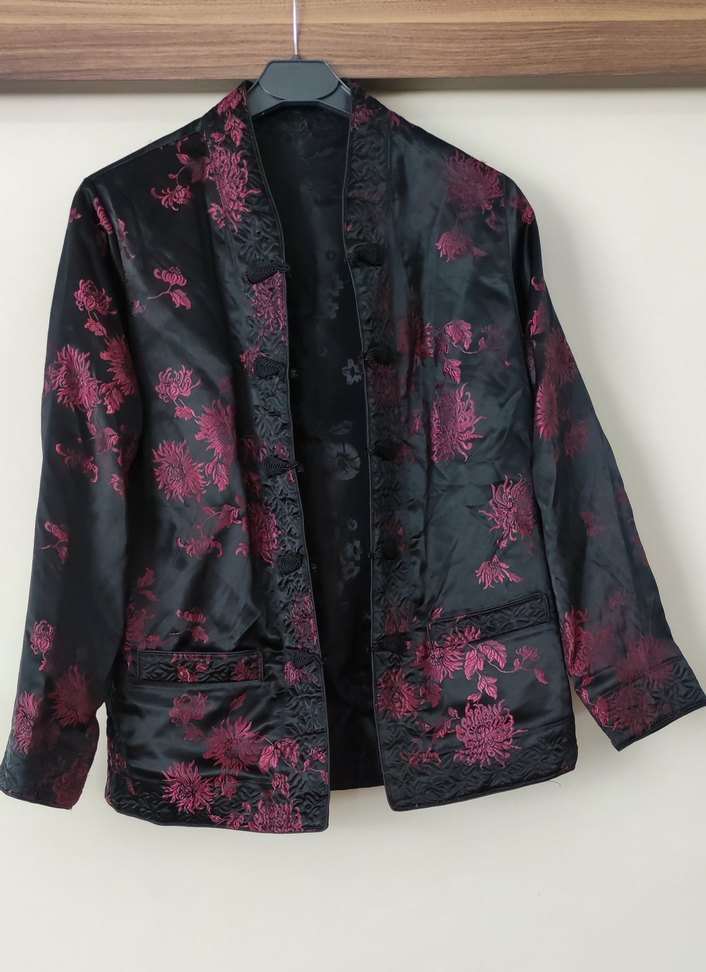 Saten kumaştan, bordo çiçek desenli kadın ceketi. Notlu yaka, uzun kollu, düğmeli ve midi boyda, ofis için uygun.