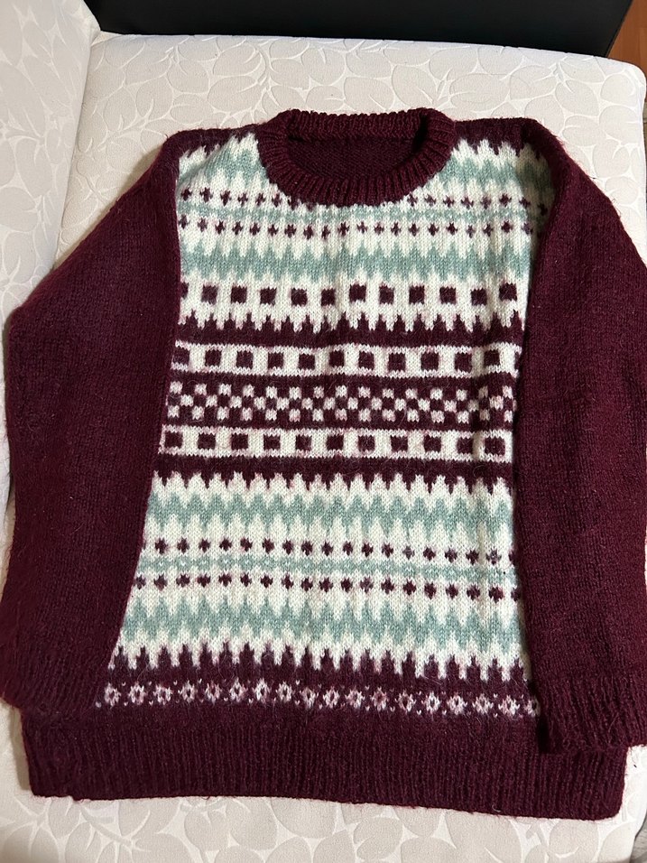 Uzun kollu, yuvarlak yaka, yumuşak triko kumaştan yapılmış bordo kadın kazak. Bohem ve retro tarzda desenli ön paneli ile rahat kesim sunar. Günlük kullanım için uygundur. S-m bedene olur