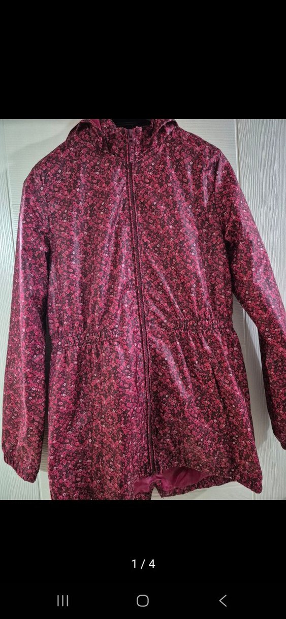 Bordo tonlarında, yüksek yakalı ve fermuarlı kız montu. Sentetik kumaştan, bohem tarzı yansıtan desenli tasarım.