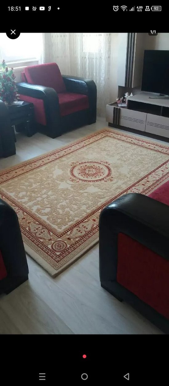 Bordo ve bej tonlarında desenli klasik halı, mekana sıcaklık katar. 4 metre Saray yeni halı