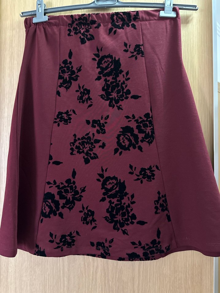 Bordo renkli eteği, siyah çiçek desenleri ve bol kesimi ile romantik akşamlar için uygun.
