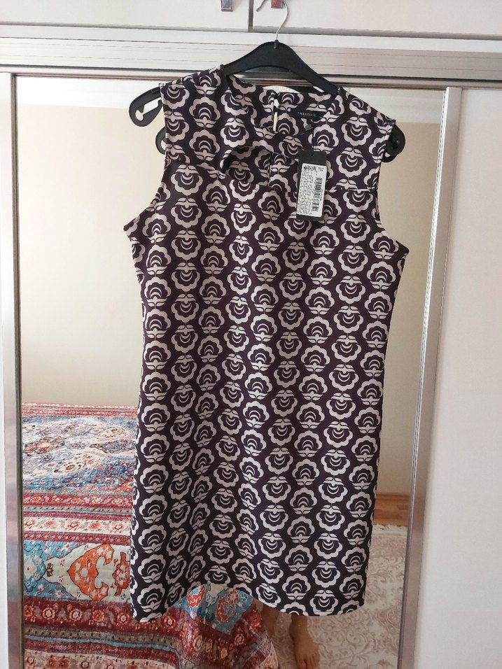 Bordo renkli, kolsuz midi elbise, baskılı desen ve yakalı tasarıma sahiptir. Zincir detaylı, günlük kullanıma uygun rahat kesim.