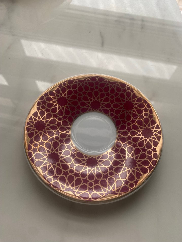 Beyaz ortası ve ince altın geometrik desenli bordo seramik kahve fincanı tabağı. ☕ sadece bir adet tabak yedek parça olarak almak isteyenlere