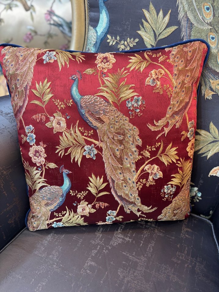 Bordo zemin üzerine işlenmiş tavuskuşu ve çiçek desenleriyle klasik bir dokunuş sunan dekoratif yastık. Kenarları biyeli fermuarlı 45*45