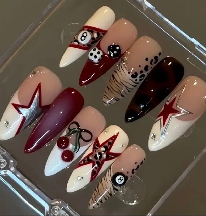 Koyu bordo renkli, yıldız, kiraz ve hayvan desenli tırnak süslemeleri, parlak yüzey ve küçük taş detaylarıyla.