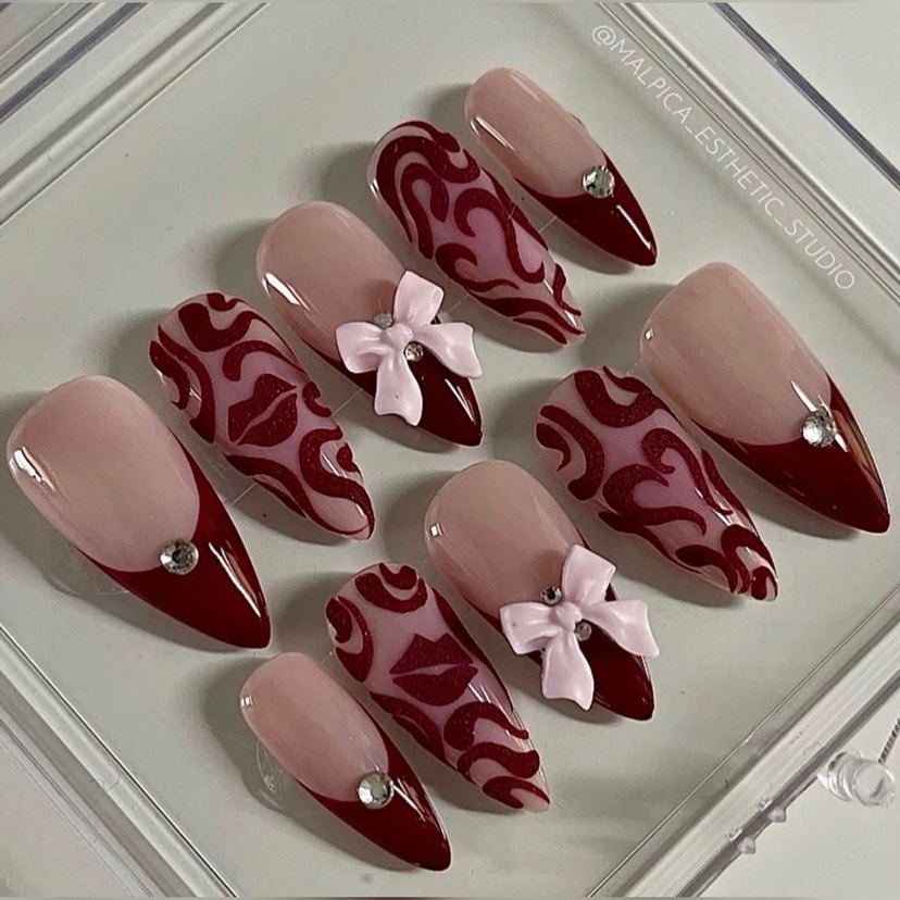 Koyu bordo tırnak süslemeleri, pembe fiyonklar ve taş detayları ile desenli şık bir tasarım sunar.
