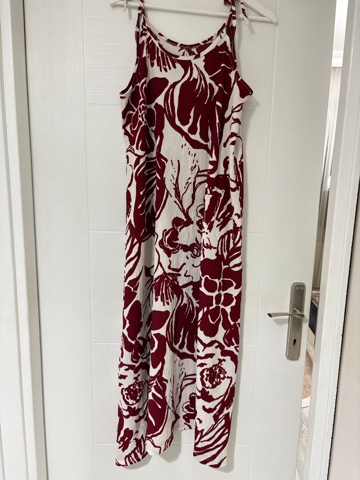 Bordo baskılı, askılı uzun kadın elbisesi, straplez yaka ve oturan kesime sahiptir. Günlük kullanım için bohem tarzını yansıtır. Geniş kesim bedensizdir 40 42 44 beden birine gayet olur