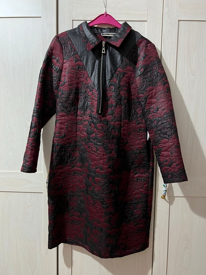 Bordo renkli, desenli sentetik kumaştan, uzun ve fermuarlı bu elbise, notlu yaka ve uzun kolludur. Gotik tarzda, ofis kullanımı için uygundur.