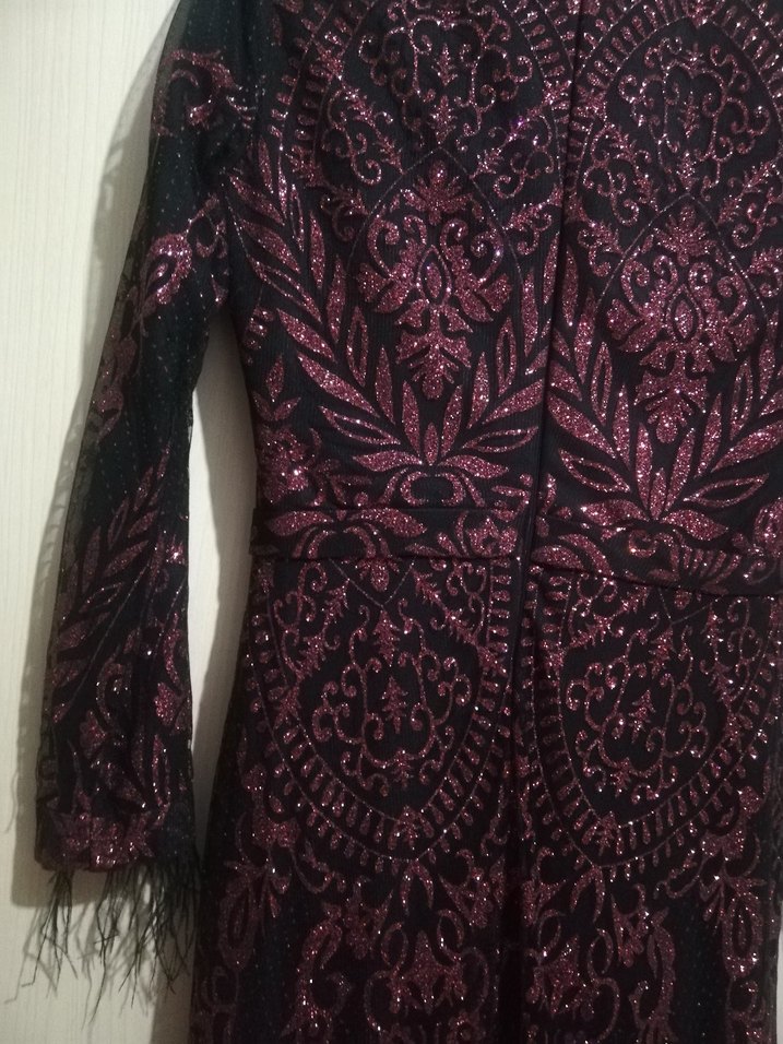 Bordo renkli, desenli ve uzun kesim kadın abiye elbise. V yaka ve uzun kollu, kol kısmında kürk detayları bulunur. Gotik ve şık tarzda, parti için uygun.