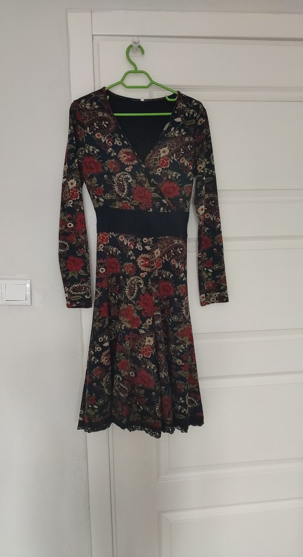 Bordo renkli, bohem çiçek desenli, uzun kollu, V yaka ve dantel detaylı, romantik akşamlar için uygun dar kesim a form elbise.