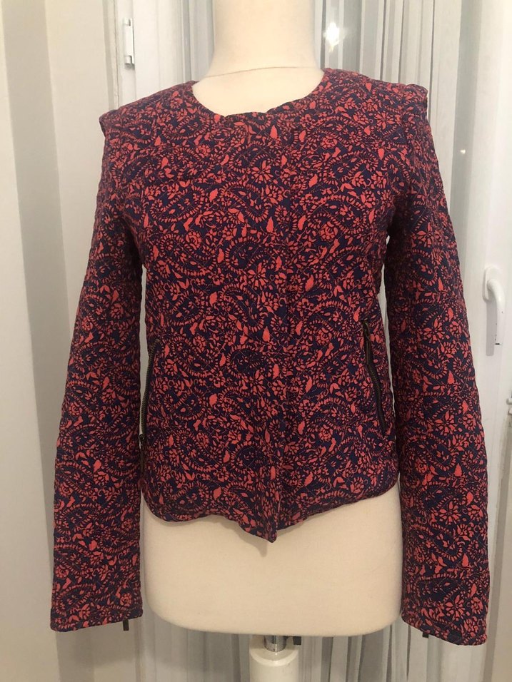 Bordo renkli, düğmeli, baskılı desenli uzun kollu, regular fit, yuvarlak yakalı kadın ceket.