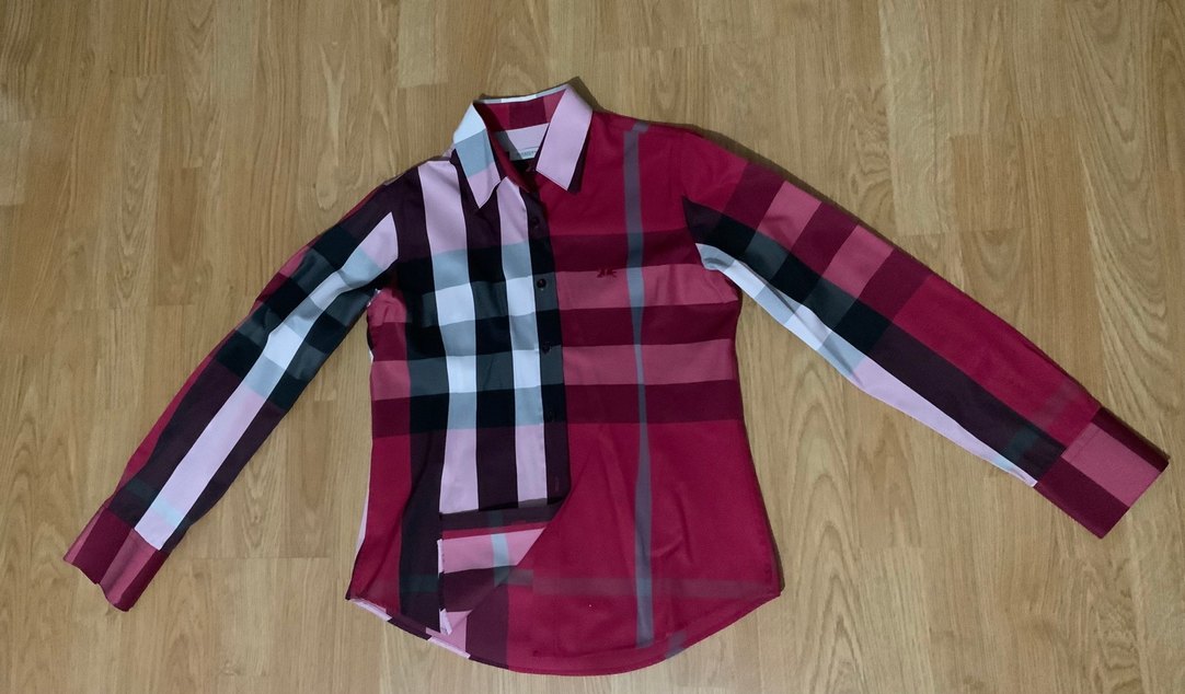 Bordo renkli, uzun kollu, yakalı ve düğmeli kadın gömleği. Desenli ve rahat kesimi günlük kullanım için uygundur.