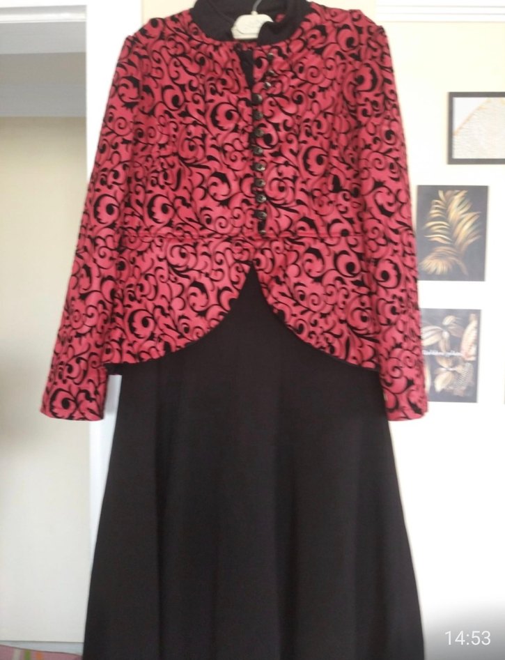 Bordo renkli, desenli sentetik kumaştan yapılmış uzun kollu kadın takımı. Notlu yaka ve düğmeli ön kısmı ile klasik gotik şıklık sunar.