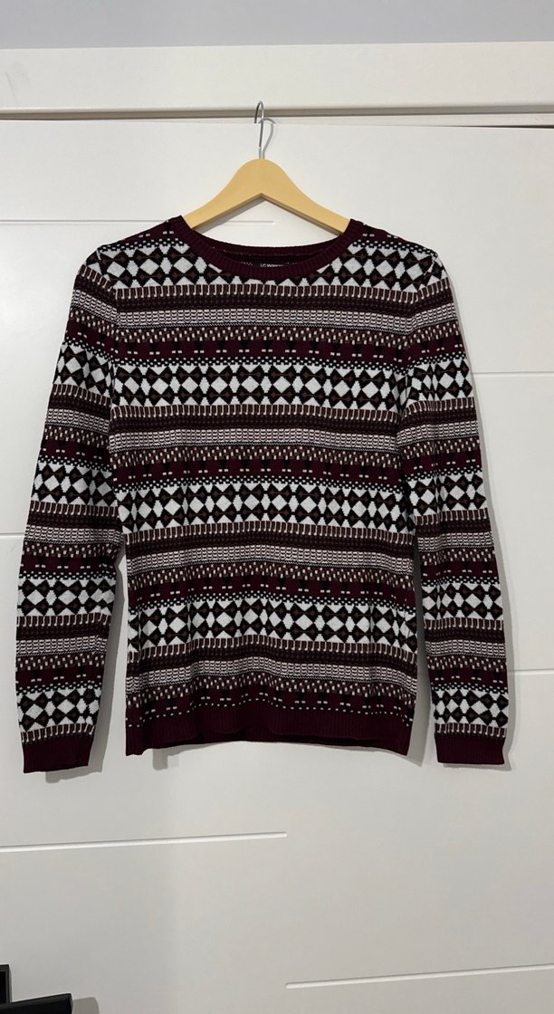 Bordo ve beyaz desenli, uzun kollu, yuvarlak yaka, fitted kesim örgü kadın kazak. Günlük ve sokak stiline uygun.